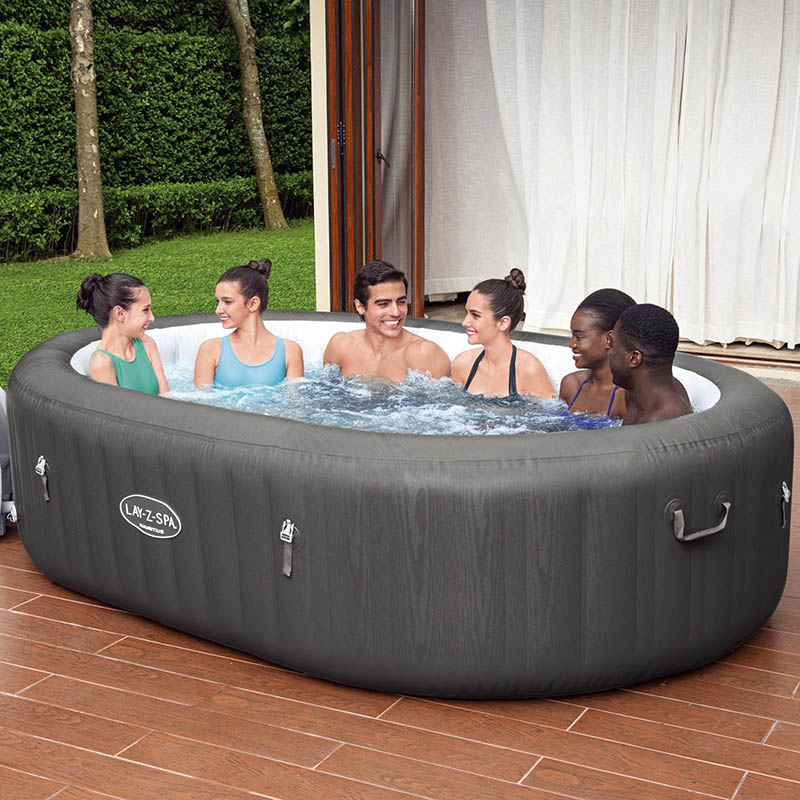 Opblaasbare ovale spa voor 5-7 personen met een realistische houtprint. Buitenkant en top ring van DuraPlus materiaal en een liner met mozaïek print op de zachte, isolerende bodem. Pomp heeft een nieuw flip up controle paneel met touchscreen, met daarachter klein plateau voor bekers enz. Pomp beschikt ook over Power Saving System (automatische start/stop timer) en Freeze shield (gaat automatisch aan onder 6° C). Met ingebouwde drainagepijp en 2 handgrepen, opblaasbare cover, filtercartridge, reparatiepatch en een Chemconnect.