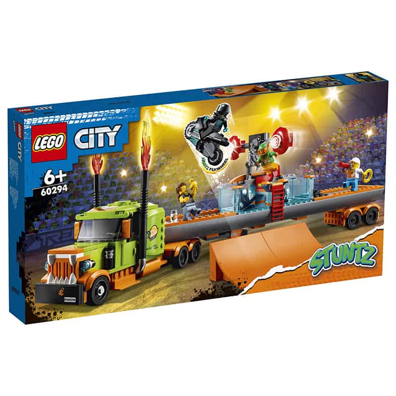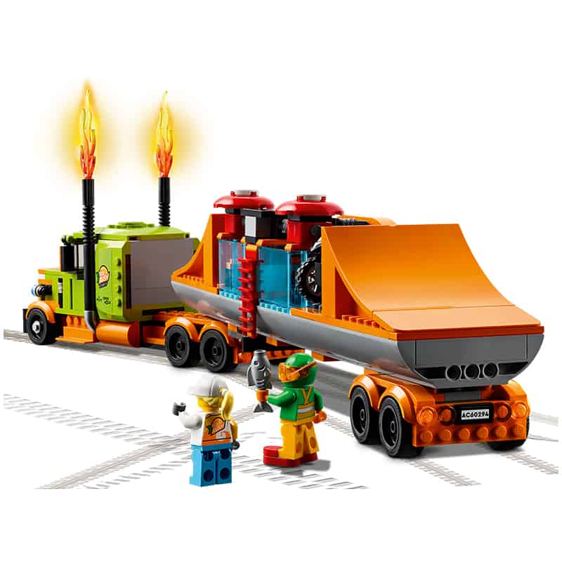 - De LEGO City Stuntshowtruck bevat een enorme speelgoedvrachtwagen met ruimte voor de lanceer- en landschansen, een speelgoed stuntmotor, en leuke attributen